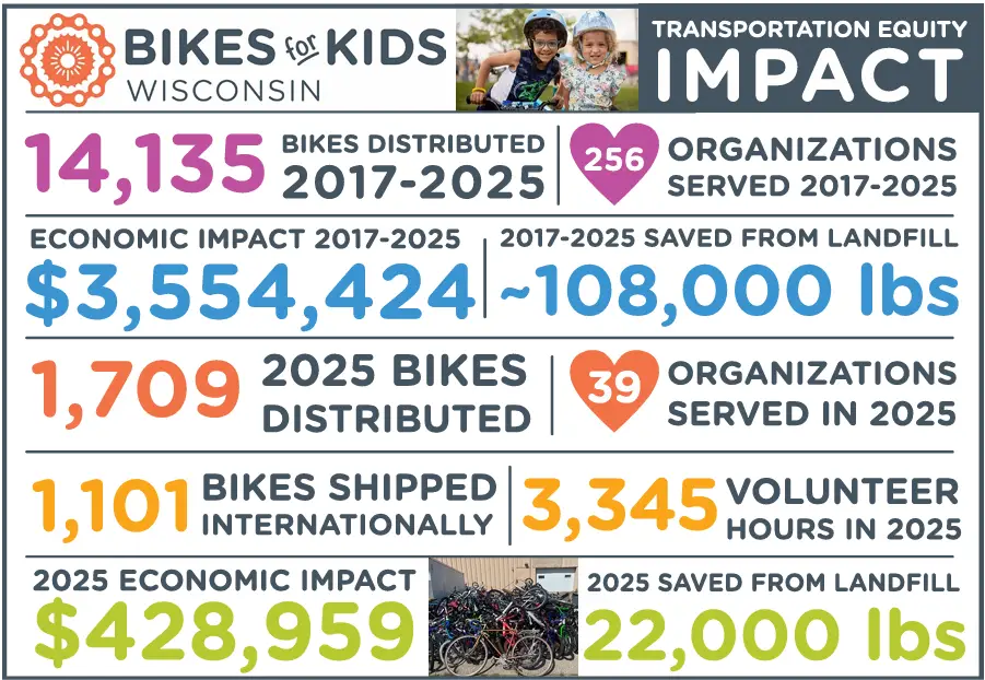 Dane County is our home and where 85% of our bike recipients and customers reside. If you live in Wisconsin and are facing a transportation crisis, please contact us and we’ll do our best to provide assistance.