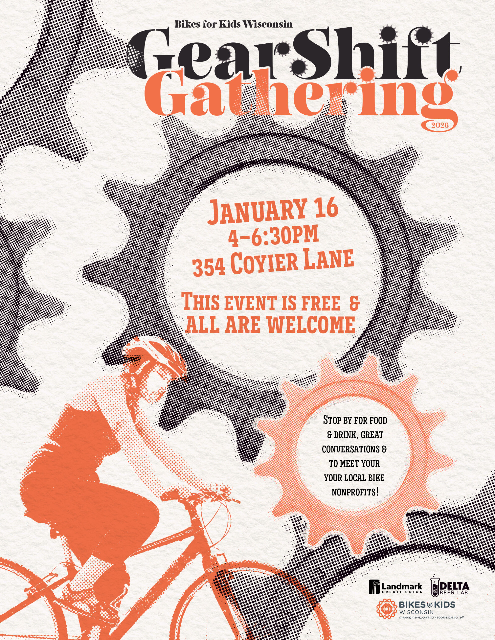 We’ll be hosting the GearShift Gathering at Bikes for Kids located at 354 Coyier Lane in south Madison on Friday, January 16 from 4-6:30pm.
